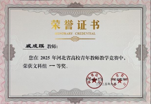 我校三位参赛教师全部斩获殊荣,实现历史突破:经济学院教师戚成蹊荣获文科组一等奖第一名佳绩,将代表河北省参加全国高校青年教师教学竞赛;管理科学与信息工程学院教师薛学亚、统计与数学学院教师侯静玉分获工科组、理科组三等奖,彰显了我校青年教师的整体实力。学校同时荣获“优秀组织奖”。